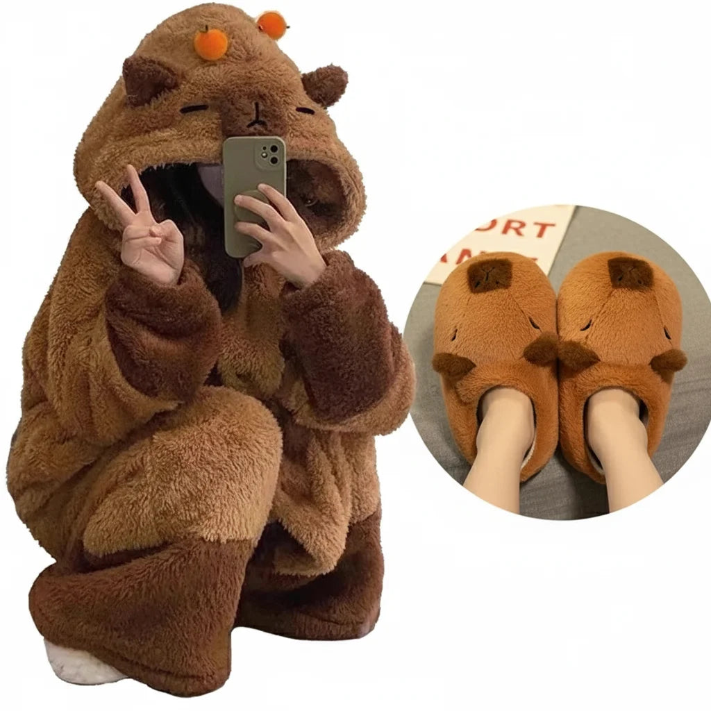 Get the complete iconic capybara aesthetic from head to toe. Slippers included for extra cuteness!