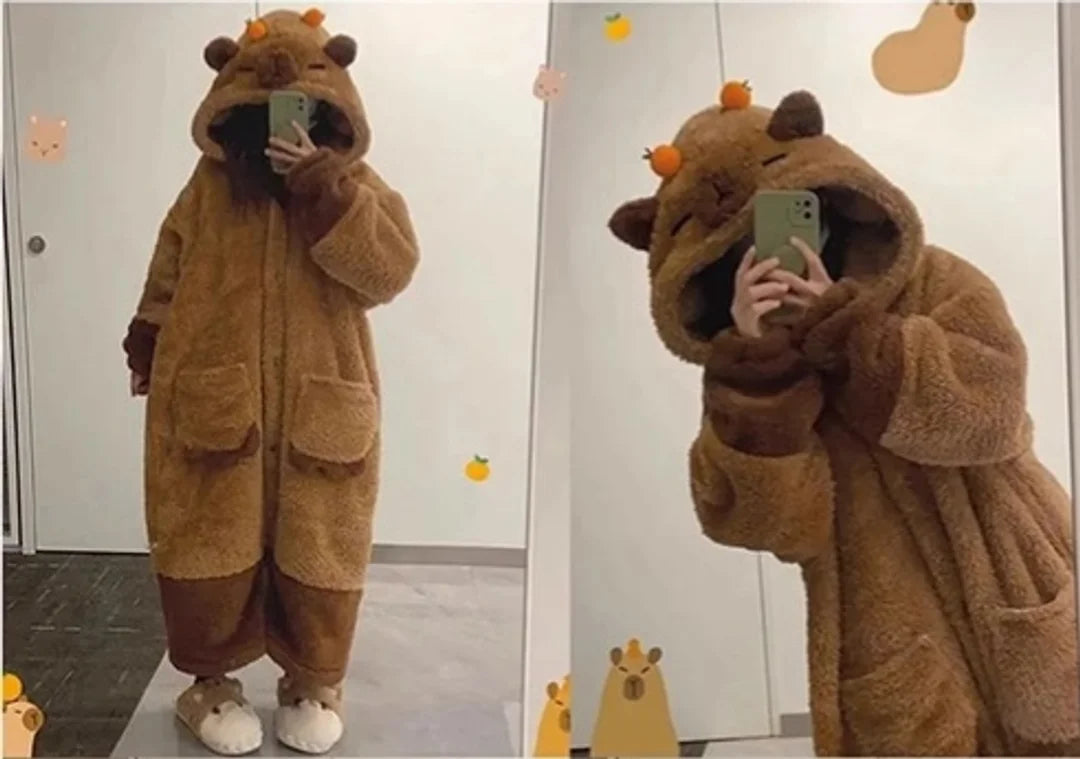 The matching slippers are the perfect capybara companion! They are often available as an add-on to complete your adorable ensemble, making your look 100% irresistibly cute from head to toe.